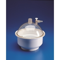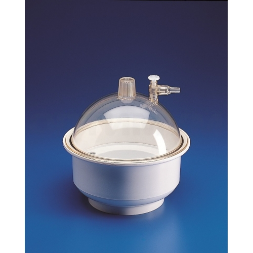 Эксикатор вакуумный с краном разработан для создания разреженной атмосферы в объеме сосуда. Предназначен для вакуумирования и хранения гигроскопичных веществ в лабораторных условиях. Выдерживает разность давлений, позволяя создать вакуум 740 мм рт.ст. со снижением, не превышающим 20 мм рт.ст. в сутки. Верхняя прозрачная крышка снабжена кольцевыми прокладками, обеспечивающими отличное прилегание крышки эксикатора к нижней части. На крышке находится вакуумный клапан из поликарбоната и кран с полиэтиленовой пробкой, которая посредством легкого вращения, позволяет впустить воздух без перемешивания. При начальном создании вакуума рекомендуется смазать уплотнительное кольцо тонким слоем масла. Внутри эксикатора находится сменный поддон для хлорида кальция или другого осушителя. Снабжен перфорированным диском, толщиной 7 мм и большим отверстием в центре. Используется при температуре окружающей среды. Для установки в эксикатор горячих тиглей рекомендуется использовать фарфоровые вставки.