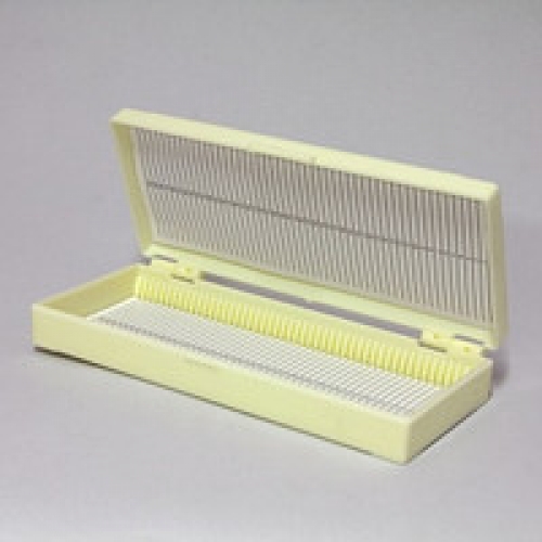 Бокс–штатив предназначен для хранения микропрепаратов на предметных стеклах размером 75х25 мм, толщиной 1 мм или 2 мм. Имеет подложку из прессованной пробки, нумерованные ячейки и поля для записи. Изготовлен бокс-штатив из полистирола. Рабочий диапазон температур -от -30 до +60°С.
