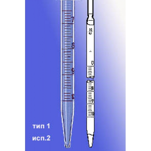 Исполнение 2, с расширением. «Ноль» (нулевая отметка) расположен в верхней части. Пипетка градуирована, градуировка синяя, Цена деления составляет 0,2 мл, погрешность измерений имеет такое же значение.